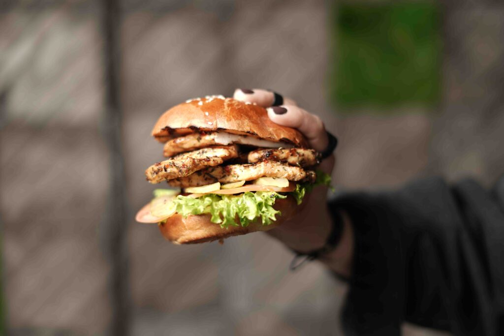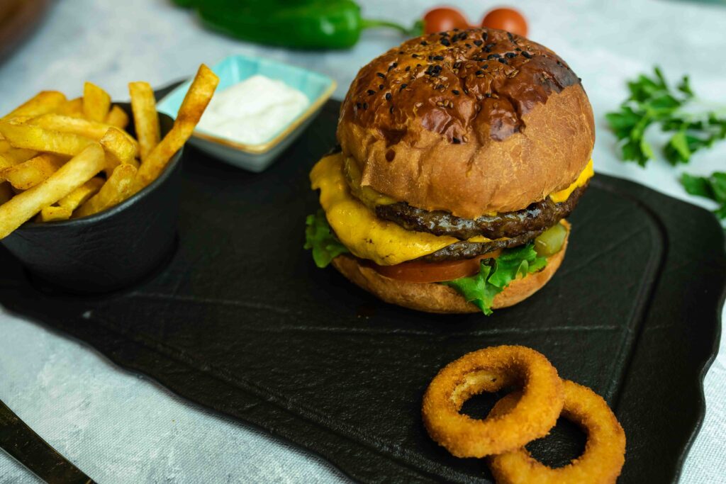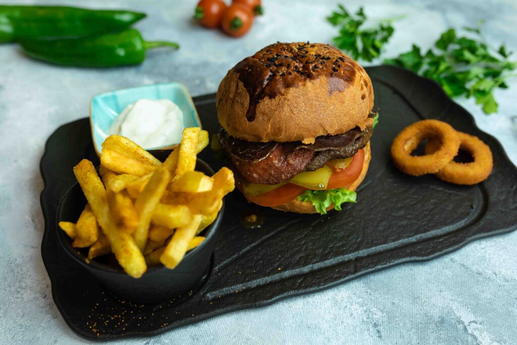 İçindekiler:EL YAPIMI ÖZEL BURGER EKMEĞİ,130GR BURGER KÖFTESİ,ICEBERG,DOMATES,SALATALIK,KORNİŞON TURŞU,KOKTEYL SOS,CHEDDAR PEYNİRİ,MOZZARELLA PEYNİRİ,IZGARA KIRMIZI BİBER,IZGARA MANTAR,BAHARATLI PARMAK PATATES,SOĞAN HALKASI